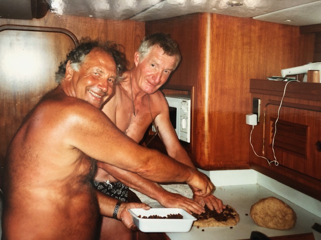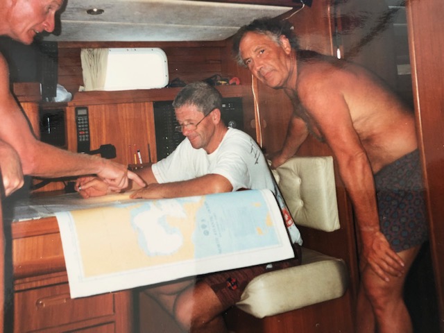 Hans, kapitein Manu Peeters en Rik bij één van onze dagelijkse activiteiten. Met Manu hebben we (waaronder Hugo Offeciers) nog vele mooie zeilreizen (Griekenland, Turkije) gedaan, maar Manu is 10 jaar geleden spijtig genoeg overleden.