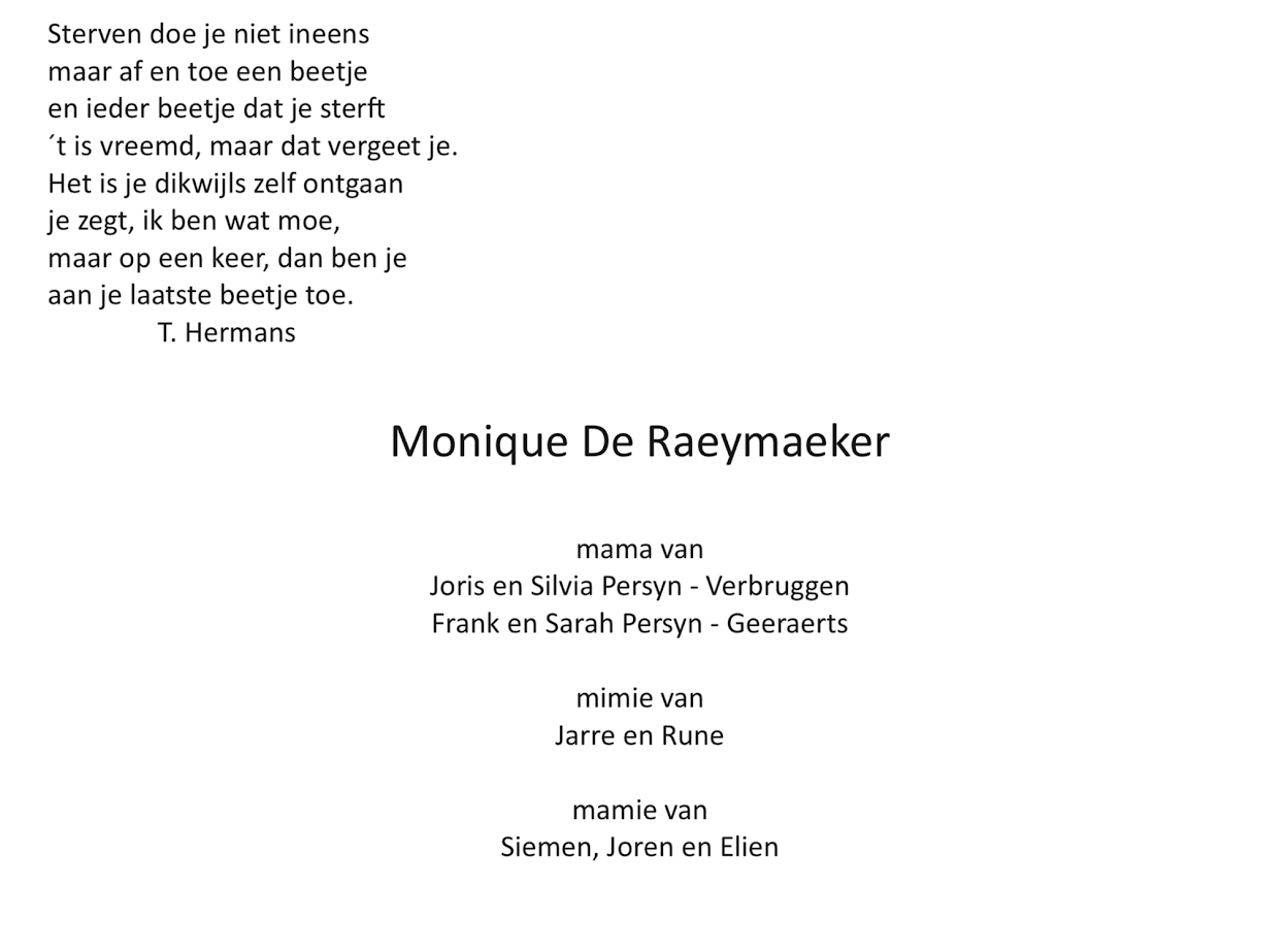 Het bericht van het overlijden van Monique verraste zowat iedereen. Ik zal mij steeds de zorgzame mama herinneren die dag en nacht bijsprong waar nodig. Haar parcours verdient respect. Op onze reünies van wat langer geleden weliswaar mochten we rekenen op gevatte tussenkomsten recht op recht aan. In kleinere kring met de koppels Hugo, Hans, Geert en Dirk waren we vaak te gast ten huize van Monique. Spijs en drank van topkwaliteit net als de gesprekken die naarmate de avond vorderde wat “ intenser” werden. Snuffelend in wat oude dozen kon ik de hand leggen op een foto van onze reünie 1974. Hugo straalt hier, as always, al zijn gentlemen kwaliteiten uit naast Monique die het duidelijk leuk vond, de rug van Ulrich moeten we er bij nemen. Een toffe dame!